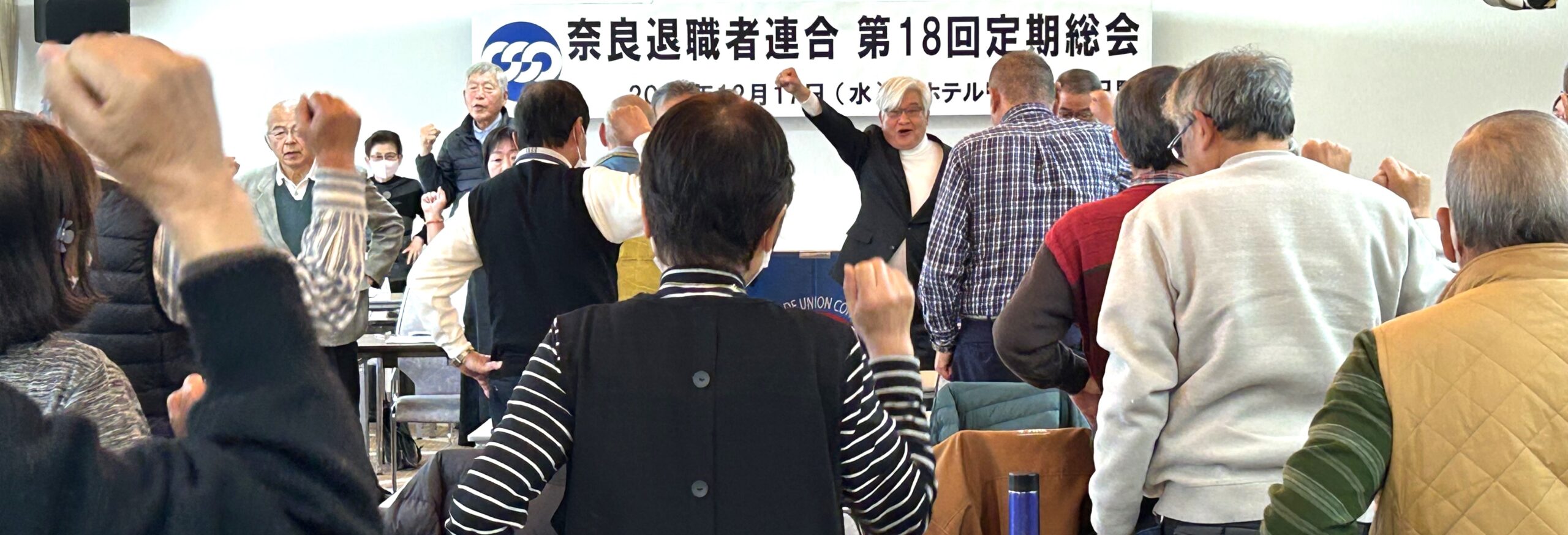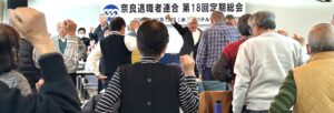 2025.12.17 奈良退職者連合第18回定期総会 2025年12月23日2025年12月23日 / by 投稿者 事務局 12月17日、ホテルリガーレ春日野において、奈良退職者連合第18回定期総会が開催された。 NTT労組退職者の会からは、事務局役員を中心に6名の代議員が出席し、 日本退職者連合や退職者連合近畿ブロック、現役組織の連合奈良と連携し、 高齢者や退職者が、活き活きと安心して暮らせる社会を目指し、 「前世代支援型の社会保障制度の実現」を目指す取り組み等が確認された。 支部協からは杉本会長を事務局長に、阿部事務局次長を会計監査に派遣しています。 隅谷会長の音頭で団結ガンバロウ~!